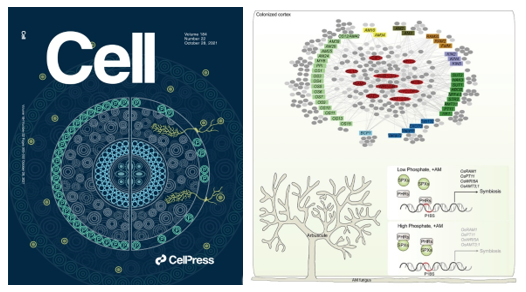 报告伊始,王二涛研究员以植物根系面对着复杂的微生物环境为切入点,分析了植物与微生物群落的关系,包括互惠共生、共栖和寄生。在互惠共生共生中,重点讲述了具有重要固氮功能的根瘤细菌共生及磷营养吸收重要来源的菌根真菌共生。在总结经30年共生领域重要的信号及营养网络构建相关工作之外,王二涛研究员深入讲述了课题组于2020年在国际顶级期刊Nature上发表的有关豆科植物根瘤共生方面的研究,文章揭示了豆科植物皮层细胞获得SHR-SCR干细胞分子模块,使其有别于非豆科植物,从而回答了共生领域的一个世纪难题:“为什么只有豆科植物能与根瘤菌截瘤固氮”。此外,王二涛研究员也分享了刚刚于2021年10月在国际顶级期刊Cell上发表封面文章“A Phosphate Starvation Response (PHR)-centered network regulates mycorrhizal symbiosis”,该研究首次揭示了植物磷信号网络控制菌根共生的分子机制。通过绘制水稻-丛枝菌根共生的转录调控网络,揭示植物磷响应转录因子PHRs通过P1BS元件正向调控菌根共生相关基因的表达,高磷环境通过PHR-SPX模块抑制菌根共生。植物直接磷营养吸收途径(根途径)和共生磷营养吸收途径(共生途径)均是受到植物的磷信号网络统一调控,回答了菌根共生领域中植物“自我调节”这一困扰领域的重要科学问题。