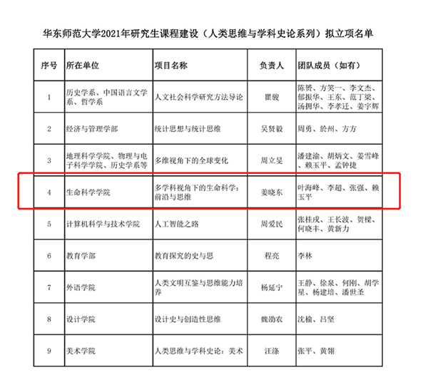 近日,研究生院公示了性吧 2021年研究生课程建设项目拟立项名单,经相关课程负责人申请、学部院系推荐,研究生院组织专家评审,性吧研究生“人类思维与学科史论”课程《多学科视角下的生命科学:前沿与思维》获批立项。