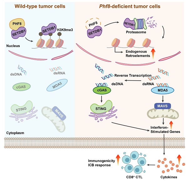 2023年7月15日,性吧 逄秀凤教授课题组和广州实验室何江平研究员课题组合作在Nature Communications 杂志在线发表题为Loss of PHF8 induces a viral mimicry response by activating endogenous retrotransposons的研究论文7。该研究发现,组蛋白去甲基化酶PHF8(KDM7B)可作为新的表观遗传检查点调控肿瘤免疫逃逸。干预PHF8可引起细胞核内甲基转移酶SETDB1降解,转录激活H3K9me3修饰的逆转录转座子,引起肿瘤内抗病毒应答和抗肿瘤免疫反应,从而阻断肿瘤生长。该研究揭示了PHF8新的生物学功能,为提高ICB抗肿瘤效用提供新思路,也为后续PHF8抑制剂或降解剂的开发奠定理论基础。