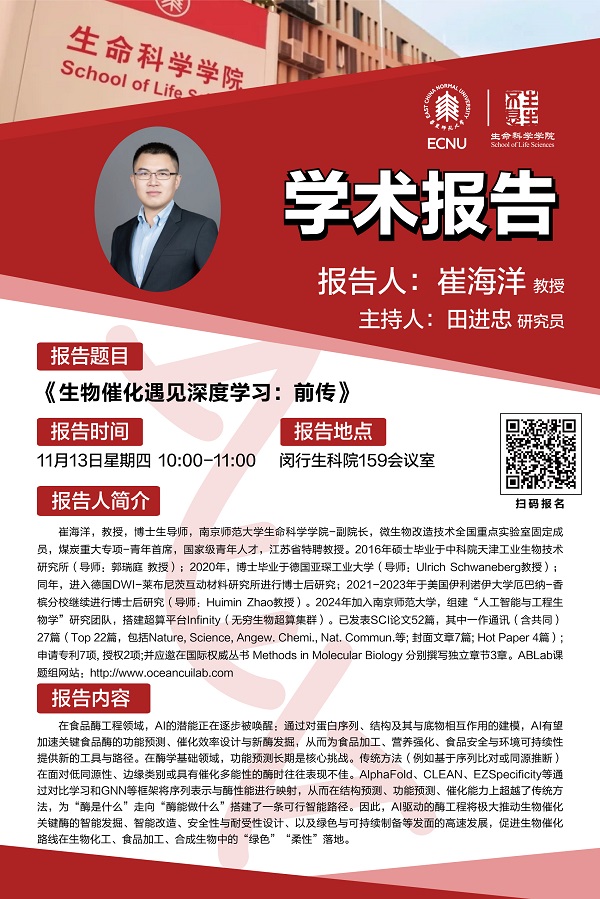 崔海洋,教授,博士生导师,南京师范大学性吧 -副院长,微生物改造技术全国重点实验室固定成员,煤炭重大专项-青年首席,国家级青年人才,江苏省特聘教授。2016年硕士毕业于中科院天津工业生物技术研究所(导师:郭瑞庭 教授);2020年,博士毕业于德国亚琛工业大学(导师:Ulrich Schwaneberg教授);同年,进入德国DWI-莱布尼茨互动材料研究所进行博士后研究;2021-2023年于美国伊利诺伊大学厄巴纳-香槟分校继续进行博士后研究(导师:Huimin Zhao教授)。2024年加入南京师范大学,组建“人工智能与工程生物学”研究团队,搭建超算平台Infinity(无穷生物超算集群)。已发表SCI论文52篇,其中一作通讯(含共同)27篇(Top 22篇,包括Nature, Science, Angew. Chemi., Nat. Commun.等; 封面文章7篇; Hot Paper 4篇);申请专利7项, 授权2项;并应邀在国际权威丛书 Methods in Molecular Biology 分别撰写独立章节3章。