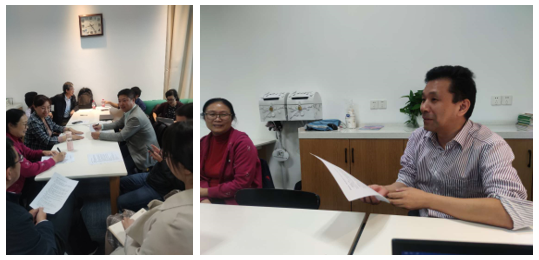 在听课结束后,听课老师们在一教的教师休息室就金老师的公开课进行了热烈的讨论。听课的老师们普遍认为金老师讲课思路清晰,知识面广,条理性强,有自己的教学风格,和学生的互动也非常自然融洽。同时也提出了一些建议,比如如何将难点与学生已有的知识或者与生活联系起来,以及如何把握学习背景有差异的学生的学习程度等。