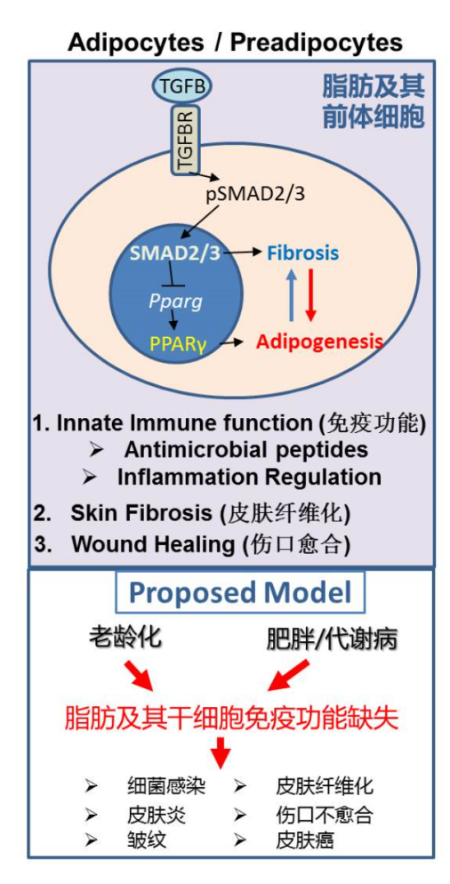 本次报告张凌娟教授先介绍了之前的研究工作,发现脂肪前体细胞可以通过释放CAMP这种抗菌肽起到抑菌作用来杀伤金黄色葡萄球菌。随后围绕这“Aging”这个普遍存在于社会的问题来拓展其研究,惊奇的发现在不同年龄阶段的小鼠前脂肪细胞的脂肪形成能力降低,但纤维化能力升高,这一转换使得CAMP的表达减少,从而抵御金黄色感染的能力也变弱。通过RNA-seq的筛选发现这一机制中是由TGF-β通路介导下游的SMAD2/3的磷酸化而导致前脂肪基因的表达减弱而纤维化相关基因的表达升高,进一步通过条件性敲除小鼠脂肪细胞上TGF-β受体验证了以上观点。