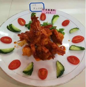 厨艺队4名队员配合默契、手脚麻利、动作规范、井然有序(图1)。在规定的一小时内完成了水果拼盘“愤怒的小鸟”、规定红案“鱼香肉丝”和自选红案“黄金脆脆虾”的制作。