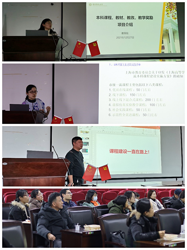 首先,周先荣老师介绍了学校教务处在课程建设、教材出版、教改课题和教学荣誉方面的资助情况,鼓励学院教师在认真开展教学的同时,关注教学改革实践,积极申报各类教改项目和教学荣誉,推进学院教学团队建设和教学水平的提升。