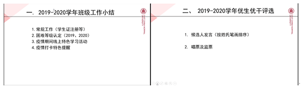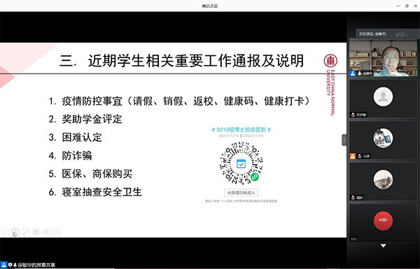 2020年11月19日晚上8点,在班长马硕的号召以及其它班委的协助筹备下,性吧2019级博士研究生以线上形式在腾讯会议app顺利召开,会议由辅导员徐敏华老师主持。围绕着2019-2020年班级工作总结、2020年优生优干评选、以及近期学生工作相关事宜通报三项议题展开,旨在总结近一年半的博士工作,增进师生之间的情感交流,也为接下来的博士生涯夯实基础,砥砺前行。