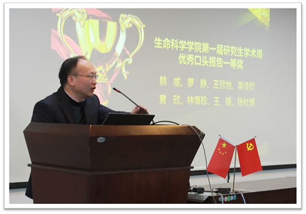 学术周优秀口头报告一等奖获得者韩威同学作为代表发言,他感谢了学院、老师的培养,分享了个人学习经历与感悟,表示不负青春、不忘感恩,在今后的科研道路上再接再厉、砥砺前行。