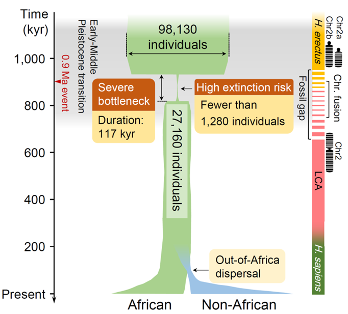 此瓶颈发生的时间,与非洲人类祖先化石缺失时期相互对应,也与非洲直立人(Homo erectus)在化石上的缺失时间匹配,更对应了一新人类物种(LCA)的产生与两条古人类2号染色体的融合阶段(图1)。说明早、中更新世过渡期严重的群体瓶颈对人类进化具有关键影响,可能决定了现代人类许多关键表型的形成。并且这一远古时期群体数量的衰减,降低了65.85%现代人群的遗传多样性,对人类生命和健康产生了深远的影响。