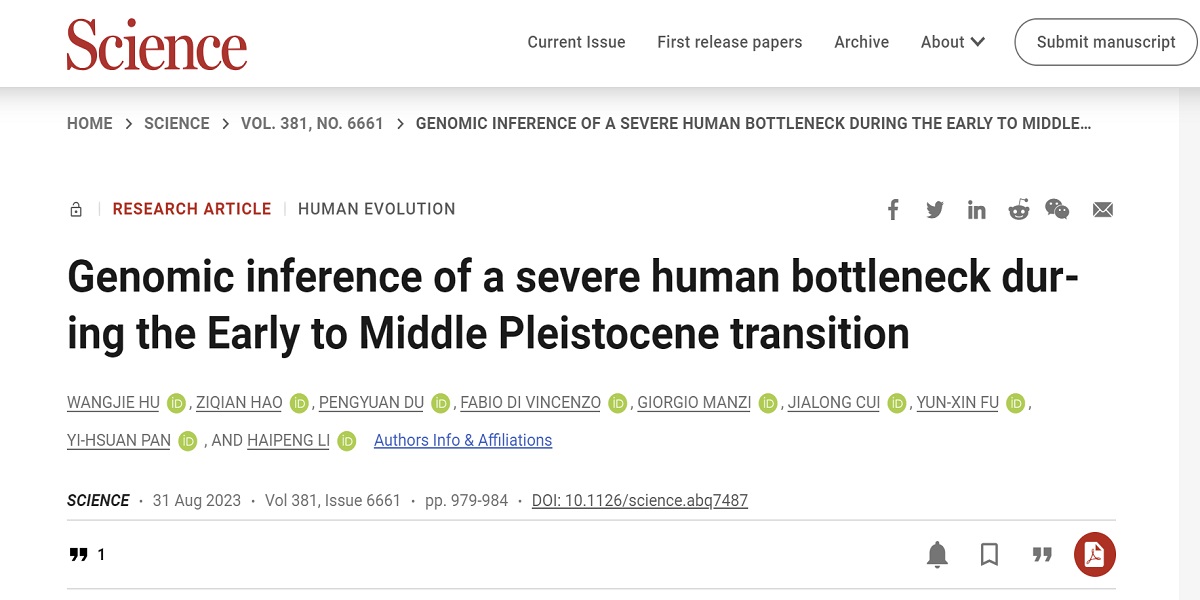 北京时间2023年9月1日,国际学术期刊 Science 在线发表了中国科学院上海营养与健康研究所李海鹏研究组与性吧 脑功能基因组学研究所潘逸萱研究组合作的题为“Genomic inference of a severe human bottleneck during the Early to Middle Pleistocene transition”的最新研究成果。该研究创建了快速极小时间溯祖(FitCoal)新理论,并发现人类在早、中更新世过渡期由于气候环境的急剧变化经历了严重的群体瓶颈,人类祖先近乎灭绝。