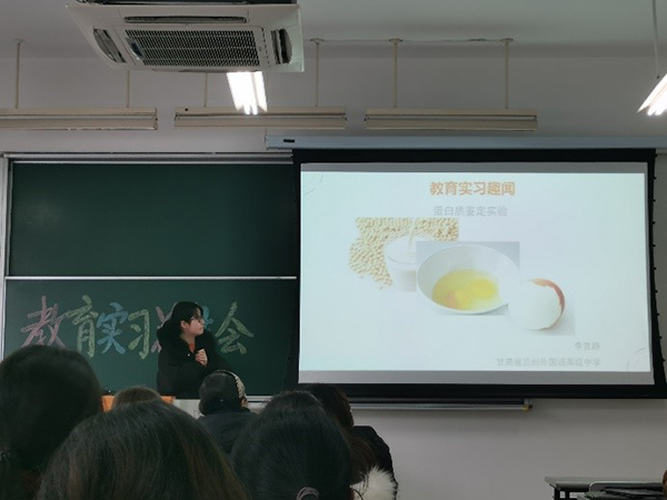 接着李克静同学汇报了甘肃省兰州市外国语高级中学的实习情况。她分享了指导老师精彩的教学案例,演示渗透装置的实验时,由于玻璃纸质量不佳,实验现象不明显,老师选择鸡蛋的卵壳膜代替玻璃纸,最后实验现象非常明显,这种创新的思维值得我们学习。