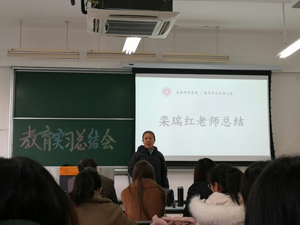 最后,栾瑞红老师对本次教育实习工作进行了总结。首先感谢实习大班长苏媛琳同学在春季学期的疫情期间在线上为同学们组织了五项教学技能比赛,花费了大量的时间和精力组织评选,促进大家居家练习教学技能、为教育实习做好准备。