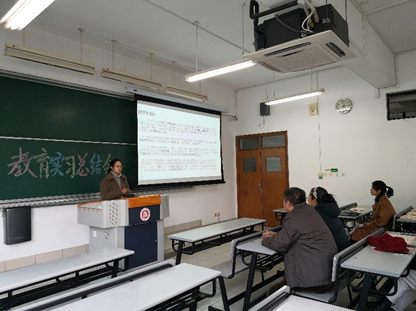 接着,马依热同学汇报了自己在新疆库尔勒市华山中学的实习情况,讲课前她会请老师审核、指点教学设计,老师觉得没问题后进行试讲,对教学过程不断反思和完善,正式授课后认真听取老师的建议。雪穷同学介绍了日喀则市上海实验中学的实习经历,她听了六十节以上的课,完成了10节授课,主持了主题班会,收获满满。雪穷和她的小伙伴们还精心制作了微视频,以vlog 的形式介绍了自己的实习生活,生动有趣。最后,张萌同学对于第四大组的实习进行了简单的总结,实习让同学们完成了身份的转变,走进了高中,对学生有了大致的了解,学习了很多的教学方法、教学技能、班级管理方法和技巧,增强了职业认同感,收获了职业幸福感。