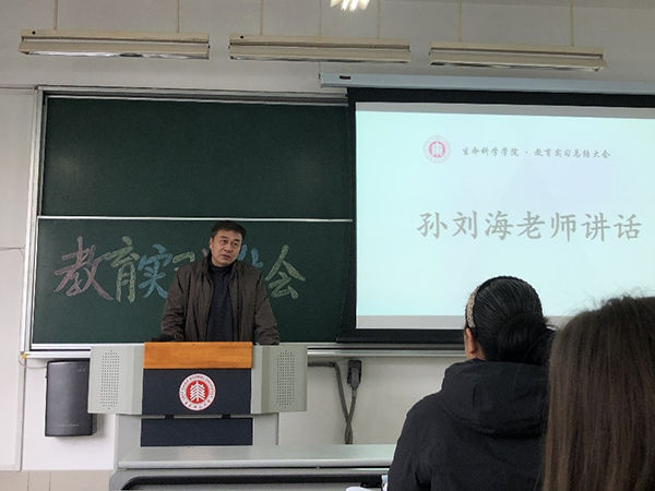 在各组汇报结束后,孙刘海老师为大家讲话。他表示听了同学们的分享后表示备受感动。看到大家实习后收获满满,孙老师送出了中肯的建议和美好的祝福:在教学方面不必急于形成自己的风格,可以广泛了解其他老师的风格,但最终形成自己的教学风格的时候一定要关注学生想要什么风格、需要什么风格,坚持学生为中心。孙老师建议我们将实习的经验以座谈会的形式面对面分享给学弟学妹,也让他们尽早熟悉教材,准备充分。最后希望大家在教育路上可以走得越来越远,就业后继续攻读硕士学位,祝愿大家在岗位上大放异彩!