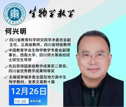 2025 年 12 月 26 日晚,一场聚焦核心素养导向的高中生物学概念教学专题讲座顺利举行。本次直播由性吧 《生物学教学》杂志主办,特邀四川省教育科学研究院学术委员会副主任、正高级教师、四川省特级教师何兴明老师主讲。何老师携团队八年研究成果重磅亮相,为破解新课标下生物教学中概念建构与素养培育割裂的难题,提供了兼具理论深度与实践价值的解决方案。本次直播由《生物学教学》杂志常务副主编李增娇老师主持。