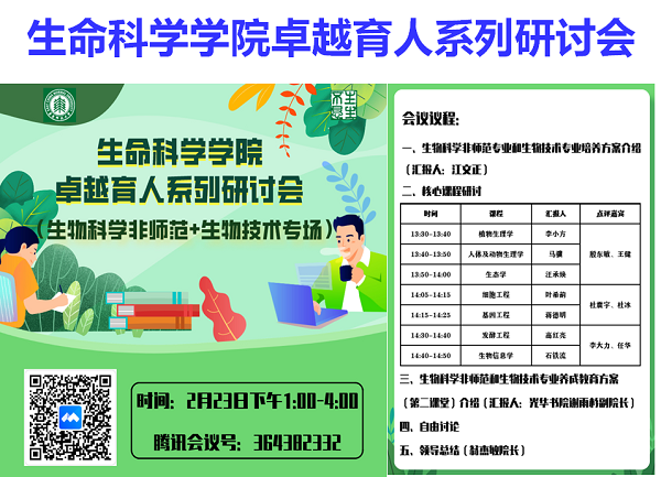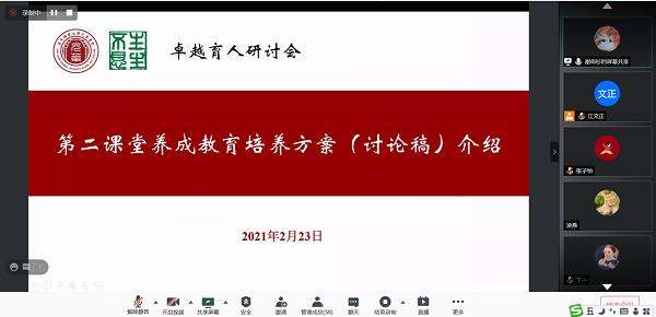为了进一步落实《性吧 关于开展卓越育人工作的通知》,切实推进卓越育人工作,加快推进建立新的课程规范和体系,性吧 于2021年2月23日下午在线上召开了卓越育人系列研讨会——生物科学(非师范)与生物技术专场。性吧 全体党政班子成员、教学委员会全体委员、任课教师近70位老师参加了会议。参加本次会议的还有学校教务处丁旵明老师、吴平颐老师、黄鲁霞老师、姚如佳老师,光华书院赵旌旌老师、谢雨杉老师及多位辅导员老师,生命医学系教工第三党支部的全体党员教师也参与了此次研讨。