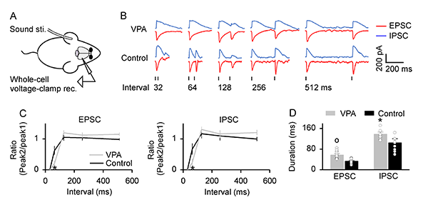 自闭症谱系障碍(Autism spectrum disorder)是影响最为广泛的神经发育性疾病之一,其核心症状为社交(言语)能力下降、兴趣狭窄及刻板样行为增加等等。自闭症患者普遍表现出的语言感知及言语交流障碍提示其脑听觉系统的功能异常,但在基础和临床实践中,病人听觉异常及其机制研究尚未得到足够关注。而周晓明团队近期发表在《Neuropharmacology》上的研究论文“Degraded cortical temporal processing in the valproic acid induced rat model of autism”表明,发育过程大脑听觉皮层神经网络兴奋/抑制失衡可能是自闭症动物模型听觉及相关行为异常的中枢机制之一。