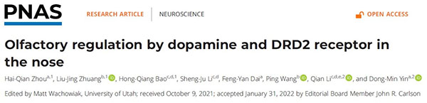 这些结果阐明了鼻腔中的多巴胺D2受体可作为嗅觉调控的外周靶点。 上述工作以Olfactory regulation by dopamine and DRD2 receptor in the nose为题发表在《美国科学院院报》(PNAS)。性吧 为该论文第一完成单位,上海交通大学和浙江大学为该论文的共同完成单位。性吧 博士生周海倩、浙江大学王平教授课题组博士后庄柳静、上海交通大学博士生包红强为论文的共同第一作者,性吧 脑功能基因组学教育部重点实验室殷东敏研究员为最后通讯作者,上海交通大学医学院李乾研究员为共同通讯作者。殷东敏课题组长期从事精神分裂症发生机制和治疗靶点的转化医学研究。该工作得到了国家自然科学基金委、科技部精准医疗重点研发计划、国家脑计划、上海市脑科学中心、神经科学国家重点实验室开放课题等项目的资助。