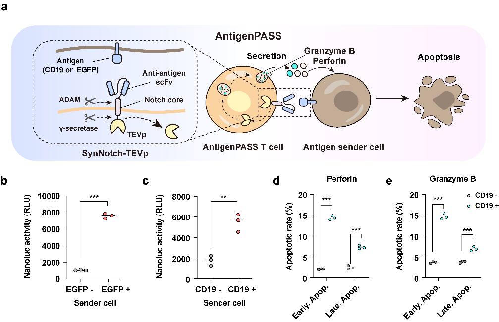 装载有antigenPASS的免疫T细胞可精准识别肿瘤细胞,释放杀伤蛋白穿孔素(Perforin)或颗粒酶B(Granzyme B),从而有效杀死肿瘤细胞(图3)。