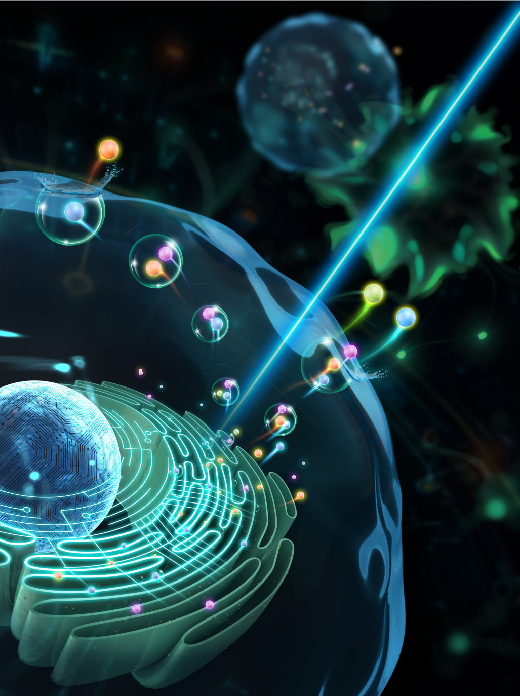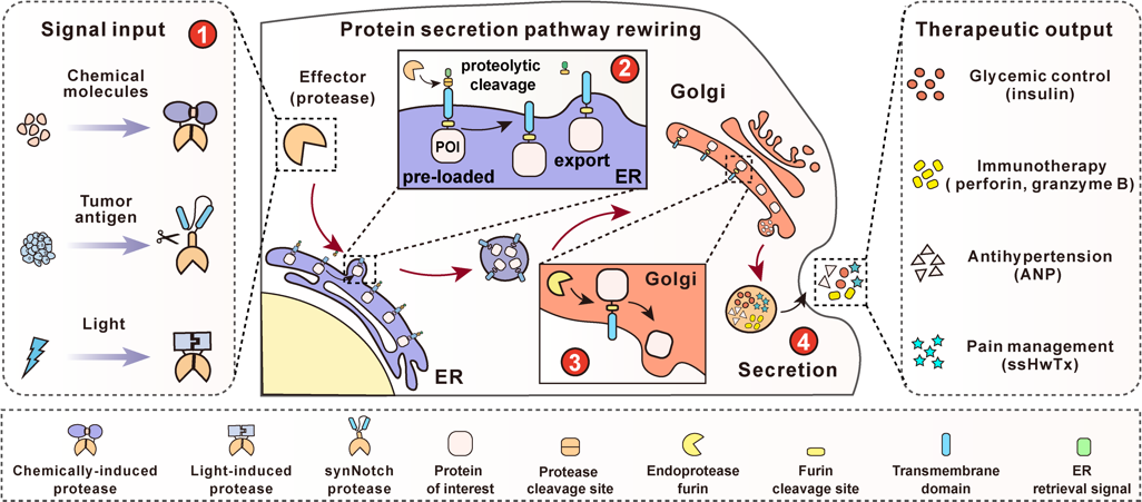 该设计图主要描绘了细胞内的基因线路PASS控制系统,特别是基因线路控制系统与细胞内质网的相互作用。示意图的关键概念是锚定在内质网治疗蛋白受外界信号控制释放,如光照等信号。