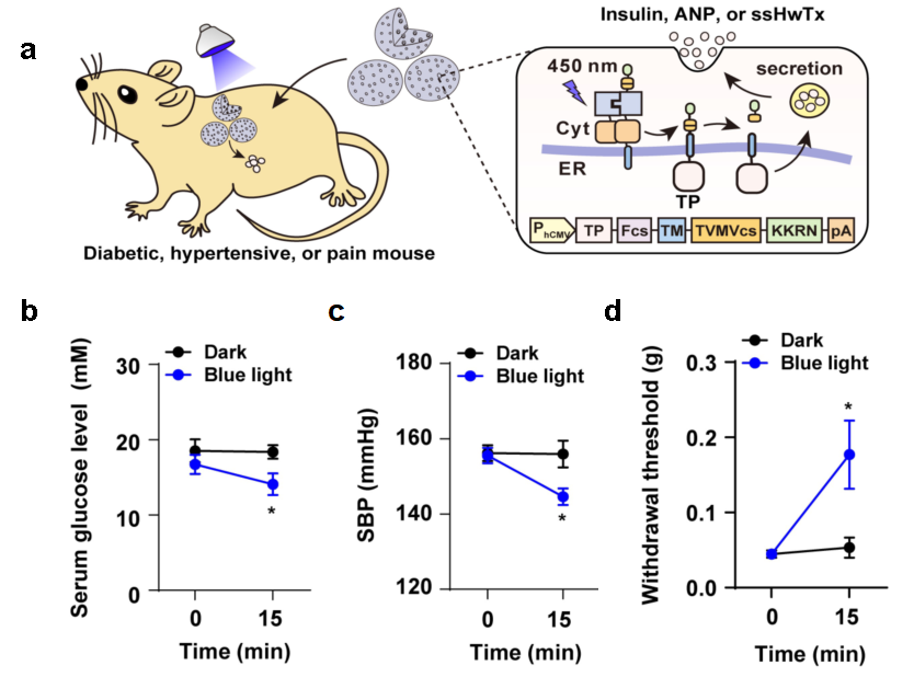 只需要一束光,就可以诱导装载有optoPASS基因线路的人工定制细胞快速释放降压肽、降糖肽、止疼肽。实验证明,将optoPASS定制化细胞植入1型糖尿病、高血压以及慢性炎症性疼痛小鼠模型的皮下,仅需光照15分钟,就能诱导治疗肽的释放,实现快速降血糖、降血压以及镇痛的效果(图4)。