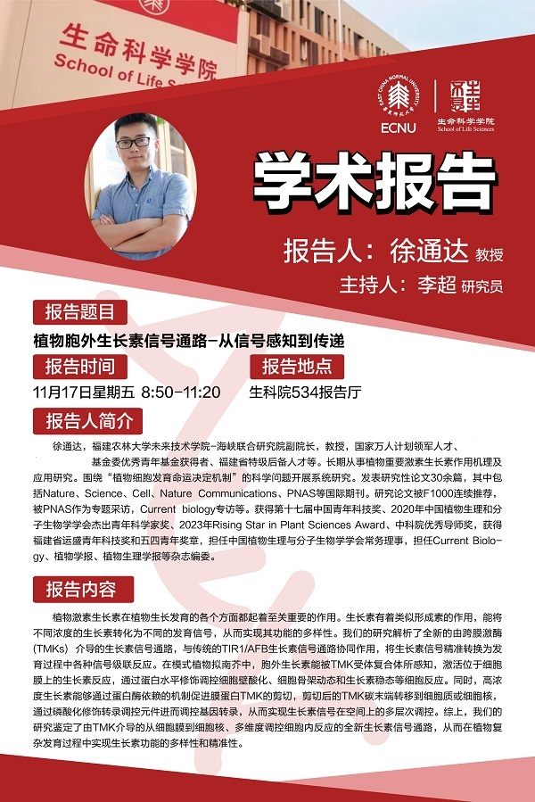 徐通达,福建农林大学未来技术学院-海峡联合研究院副院长,教授,国家万人计划领军人才、基金委优秀青年基金获得者、福建省特级后备人才等。长期从事植物重要激素生长素作用机理及应用研究。围绕“植物细胞发育命运决定机制”的科学问题开展系统研究。发表研究性论文30余篇,其中包括Nature、Science、Cell、Nature Communications、PNAS等国际期刊。研究论文被F1000连续推荐,被PNAS作为专题采访,Current biology专访等。获得第十七届中国青年科技奖、2020年中国植物生理和分子生物学学会杰出青年科学家奖、2023年Rising Star in Plant Sciences Award、中科院优秀导师奖,获得福建省运盛青年科技奖和五四青年奖章,担任中国植物生理与分子生物学学会常务理事,担任Current Biology、植物学报、植物生理学报等杂志编委。