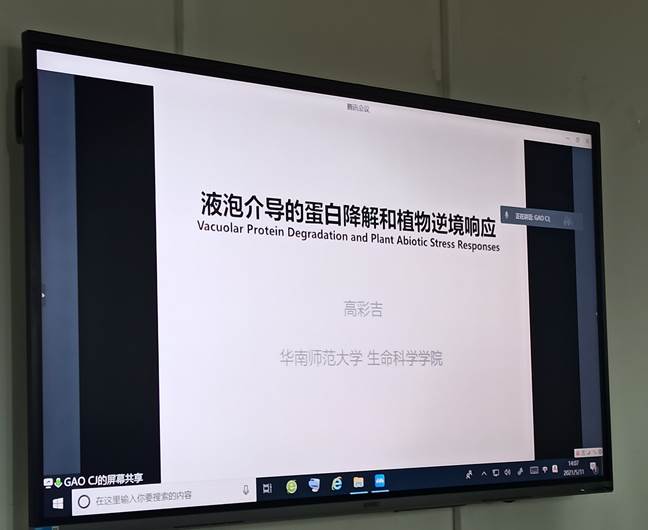 2021年5月31日,华南师范大学高彩吉教授在线上为性吧 师生做了题为“植物液泡介导的降解途径调控机制”的学术报告。本次报告由赵琼研究员主持,性吧植物学科李小芳教授、晏军研究员、孙越副教授等老师及生科院的同学们参加了本次报告,报告还吸引了来自上海交大的数位相关领域老师的参与。