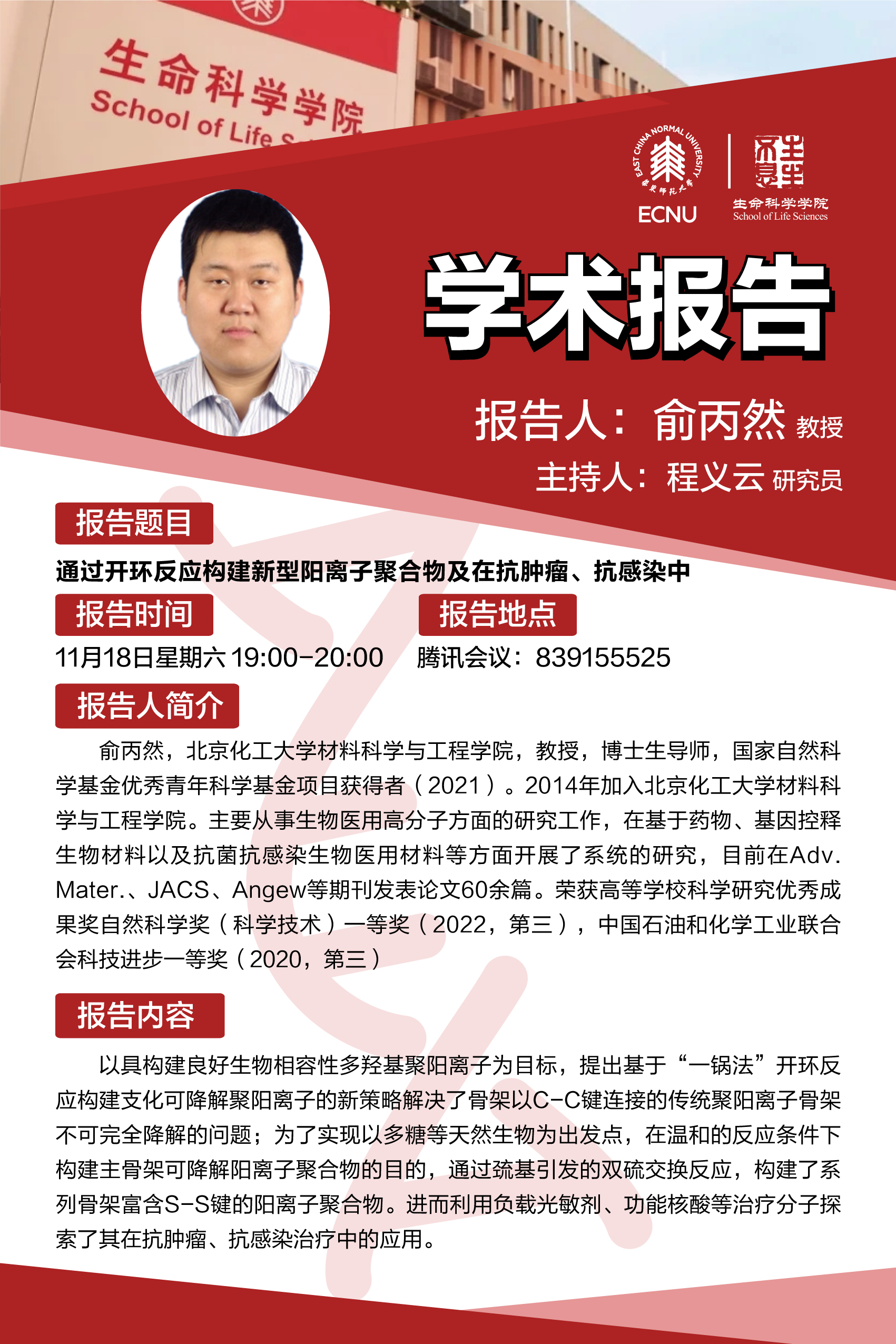 报告题目:通过开环反应构建新型阳离子聚合物及在抗肿瘤、抗感染中应用