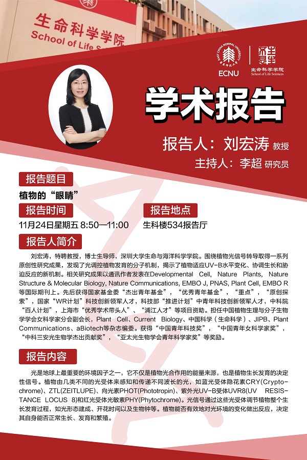 刘宏涛,特聘教授,博士生导师,深圳大学生命与海洋科学学院。围绕植物光信号转导取得一系列原创性研究成果,发现了光调控植物发育的分子机制,揭示了植物适应UV-B水平变化、协调生长和胁迫反应的新机制。相关研究成果以通讯作者发表在Developmental Cell, Nature Plants, Nature Structure & Molecular Biology, Nature Communications, EMBO J, PNAS, Plant Cell, EMBO R等国际期刊上。先后获得国家基金委“杰出青年基金”,“优秀青年基金”,“重点”,“原创探索”,国家“WR计划”科技创新领军人才,科技部“推进计划”中青年科技创新领军人才,中科院“百人计划”,上海市“优秀学术带头人”、“浦江人才”等项目资助。担任中国植物生理与分子生物学学会女科学家分会副会长,Plant Cell、Current Biology、中国科学(生命科学)、JIPB、Plant Communications、aBiotech等杂志编委。获得“中国青年科技奖”,“中国青年女科学家奖”,“中科三安光生物学杰出贡献奖”,“亚太光生物学会青年科学家奖”等奖励。