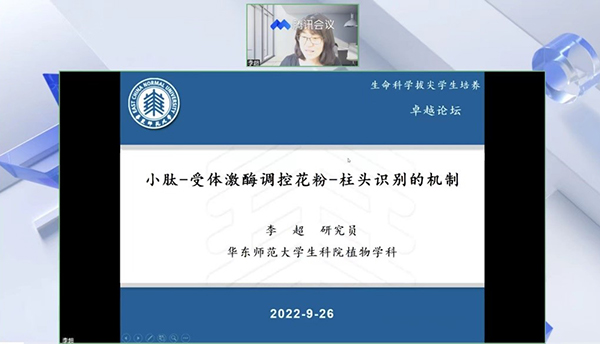 2022年9月26日下午,性吧 研究员,植物学科主任李超博士受邀,为广大师生做了题为“花粉和柱头的邂逅——小肽-受体激酶调控花粉-柱头识别的机制”的报告。本次报告由性吧 副院长江文正教授主持,通过拔尖计划2.0全国线上书院以及性吧 微信视频号面向全国直播,线上参与人数超过9000人。