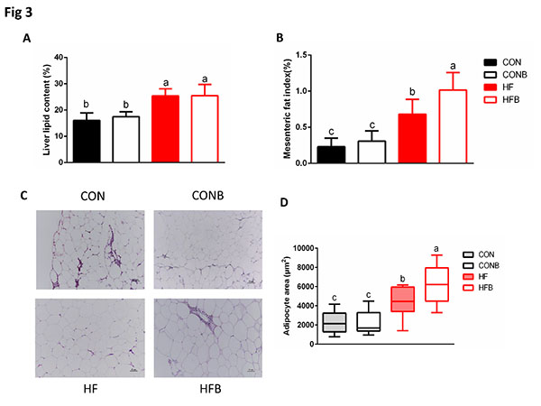 课题组发现,HFB组与其他组相比,体脂含量显著增加。同时,结果表明,高脂摄入可以造成罗非鱼肝脂含量的显著增加,但是S1细菌的添加并没有进一步造成肝脏脂含量的显著差异。然而,当高脂饲料与S1细菌联合施用时,鱼体的腹腔脂肪增多,脂肪细胞也更大,表明S1菌促进了鱼类对饲料脂肪的获取,并将其储存于腹腔脂肪组织中(图4)。