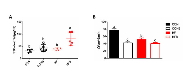 课题组通过油脂灌喂实验发现, 高脂饮食中添加S1细菌会提高脂转运相关基因mgat2和Apob的表达水平,并最终增加肠道对食物甘油三酯的吸收和转运效率(图5)。进一步的FITC标记葡聚糖-尤斯室测定表明,无论是在体实验还是肠道细胞实验,S1细菌的添加还增加了罗非鱼的肠道通透性(图6)。这些说明,增加罗非鱼肠道对摄入脂肪的吸收率是S1细菌促进鱼体脂肪沉积的主要原因。