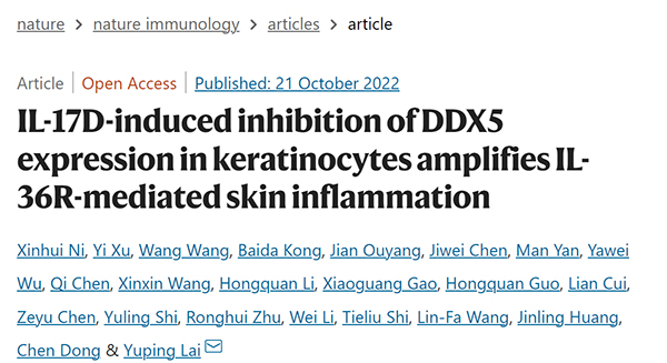 10月21日,赖玉平教授团队在 Nature Immunology 发表了题为 IL-17D-induced inhibition of DDX5 expression in keratinocytes amplifies IL-36R-mediated skin inflammation 的研究成果。该研究发现RNA解旋酶DDX5结合剪接因子SF2调节角质形成细胞中IL-36R的剪接生成IL-36R和sIL-36R,而AD和银屑病皮损中的细胞因子IL-17D激活CD93-p38 MAPK-AKT-SMAD2/3信号通路抑制角质形成细胞中的DDX5来促进IL-36R的产生,但抑制sIL-36R的表达。sIL-36R通过与IL-36R竞争结合其配体IL-36来拮抗IL-36-IL-36R信号传导,从而抑制角质形成细胞的炎症应答。在小鼠角质形成细胞中特异敲除Ddx5(Ddx5∆KC)使得小鼠更易得AD和银屑病,而给Ddx5∆KC AD或银屑病小鼠注射sIL-36R或在角质形成细胞中回补sIL-36R均能抑制皮肤炎症,减轻AD和银屑病小鼠的疾病症状。