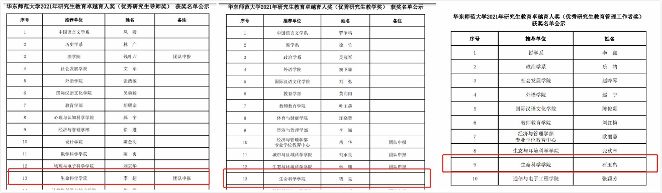 近日,研究生院公示了性吧 2021年研究生教育卓越育人奖获奖名单,经个人申报、学部院系推荐、研究生院组织最终评审,性吧三位教师及团队荣获研究生教育卓越育人奖,其中李超研究员团队荣获优秀研究生导师奖,钱旻教授荣获优秀研究生教学奖,石玉帛老师荣获优秀研究生教育管理工作者奖。