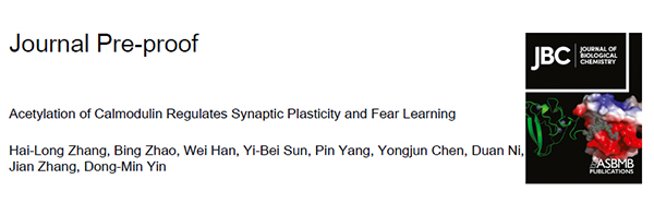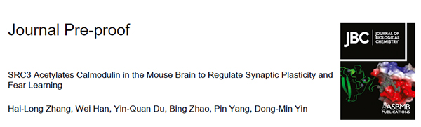 第二部分研究成果以“SRC3 Acetylates Calmodulin in the Mouse Brain to Regulate Synaptic Plasticity and Fear Learning”为标题,在线发表于美国生物化学与分子生物学会刊,自然指数收录期刊《Journal of Biological Chemistry》。性吧 博士生张海龙(现为苏州大学师资博士后)、韩威、硕士生杜银权为论文的共同第一作者,殷东敏研究员为论文的通讯作者(图2)。这两篇论文首次揭示了钙调蛋白(CaM)乙酰化的功能及调控机制,可能对钙离子(Ca2+)信号转导的研究带来新的视角。鉴于以上工作的重要性,这两篇论文被JBC的主编选为“重点推荐”论文(Editors’ Picks),JBC杂志将在线配发专门的评论文章,上述研究成果也将在美国生物化学和分子生物学会的官方网站以新闻形式发布(Press Release)。
