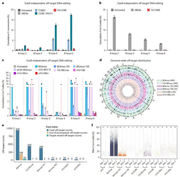 通过Cas9依赖性的脱靶位点、Cas9非依赖性脱靶的R-loop检测和项目组前期开发的最灵敏的Detect-seq以及RNA脱靶的转录组分析,令人兴奋的是,Td-CGBE/Td-CBEs变体几乎不引起随机的DNA和RNA脱靶编辑(图3),展示出了极高的应用安全性。