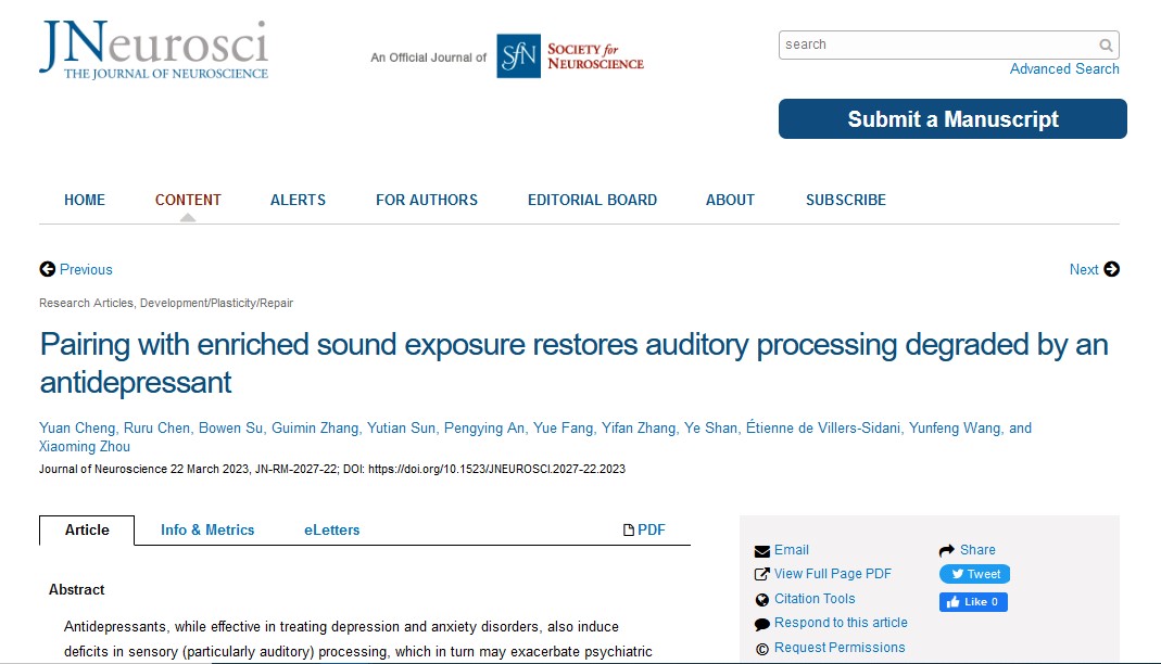 性吧 、脑功能基因组学教育部重点实验室周晓明教授课题组近期在线发表在《Journal of Neuroscience》上的研究论文Pairing with enriched sound exposure restores auditory processing degraded by an antidepressant表明,慢性氟西汀暴露诱发成年大鼠听觉分辨行为及脑听皮层神经元声调谐特性异常。而氟西汀用药结合丰富声暴露可以改善药物对听觉的影响,这种变化可能与药物引致的脑抑制性状态改变有关。这些结果对理解抗抑郁药物影响听觉的中枢机制有重要意义,同时提示将抗抑郁药治疗与丰富的感觉刺激相结合可以优化临床效果。