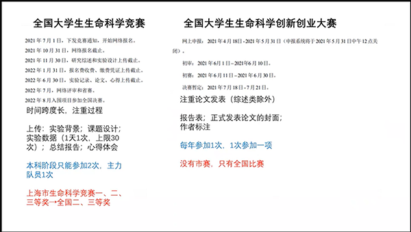 第三个部分是高年级同学的经验分享,首先由李诗雨介绍了他的实验室经历与感受建议以及两大竞赛的经验。她首先讲述了自己大二一年在何老师实验室的经历以及在实验室学到的具体内容。之后她从进实验室前后两个方面提出了几点建议。她告诉我们在进实验室之前要有明确的目标与充足的时间准备,并且在选择实验室方向时一定要结合自己的兴趣进行选择。之后她从时间,实验室相处与自身能力三个方面提出了几点建议。最后她着重介绍了两大竞赛的异同点以及注意事项,包括生命科学竞赛在上传材料方面的信息泄露与页数限制问题。最后她强调上述竞赛大部分都是以团队形式进行,一群好的队友可以帮助我们更加顺利地完成整个过程。