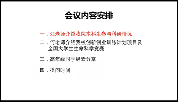 2021年9月8日,生物专业科创项目经验分享交流会在线上举行。交流会由何祝清老师主持,邀请到性吧 副院长江文正老师,以及19级生物科学专业的李诗雨以及18级生物科学专业的渠荟超与同学们进行经验分享,70多名生科学子参加。