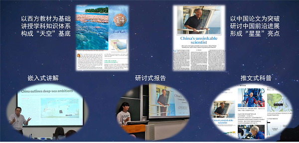 “水生生物学”开发出课程思政“星空模式”,以英文原版教材为基础,将学科知识和框架准确传授给学生,构成“天空”基底;同时以发表在Nature或Science上的涉及中国水生生物领域的论文为着力点,构建“中国人物”、“中国成就”、“中国挑战”三个微系列,形成“星星”亮点,用嵌入式讲解、研讨式报告、推文式科普等方式点亮“星星”,形成星光璀璨的格局。
