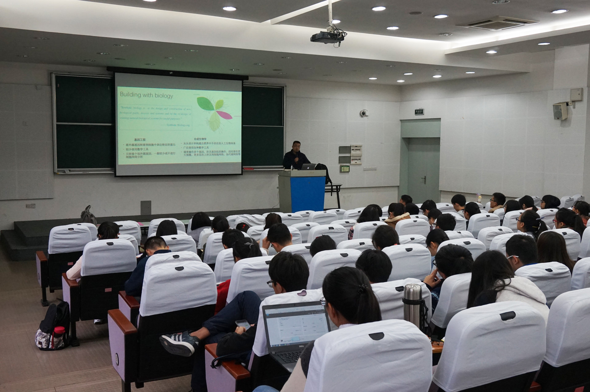 王勇研究员首先从合成生物学与基因工程的区别讲起,为同学们清楚地辨析了合成生物学的概念,并简要介绍了近年来合成生物学研究的重大事件及重要进展,细致耐心地向同学们讲述了什么是合成生物学,他条理分明、深入浅出的讲解,帮助大一大二的学生们对处于学术前沿的研究成果有了吸收理解得更加充分。接着,王勇研究员分“调控原件的人工理性设计”等三个部分,通过举例向大家生动地介绍了他的实验室所从事的主要研究以及合成生物学对于生产生活的重要意义。最后,王勇研究员就合成生物学的问题与展望为此次演讲做了总结。