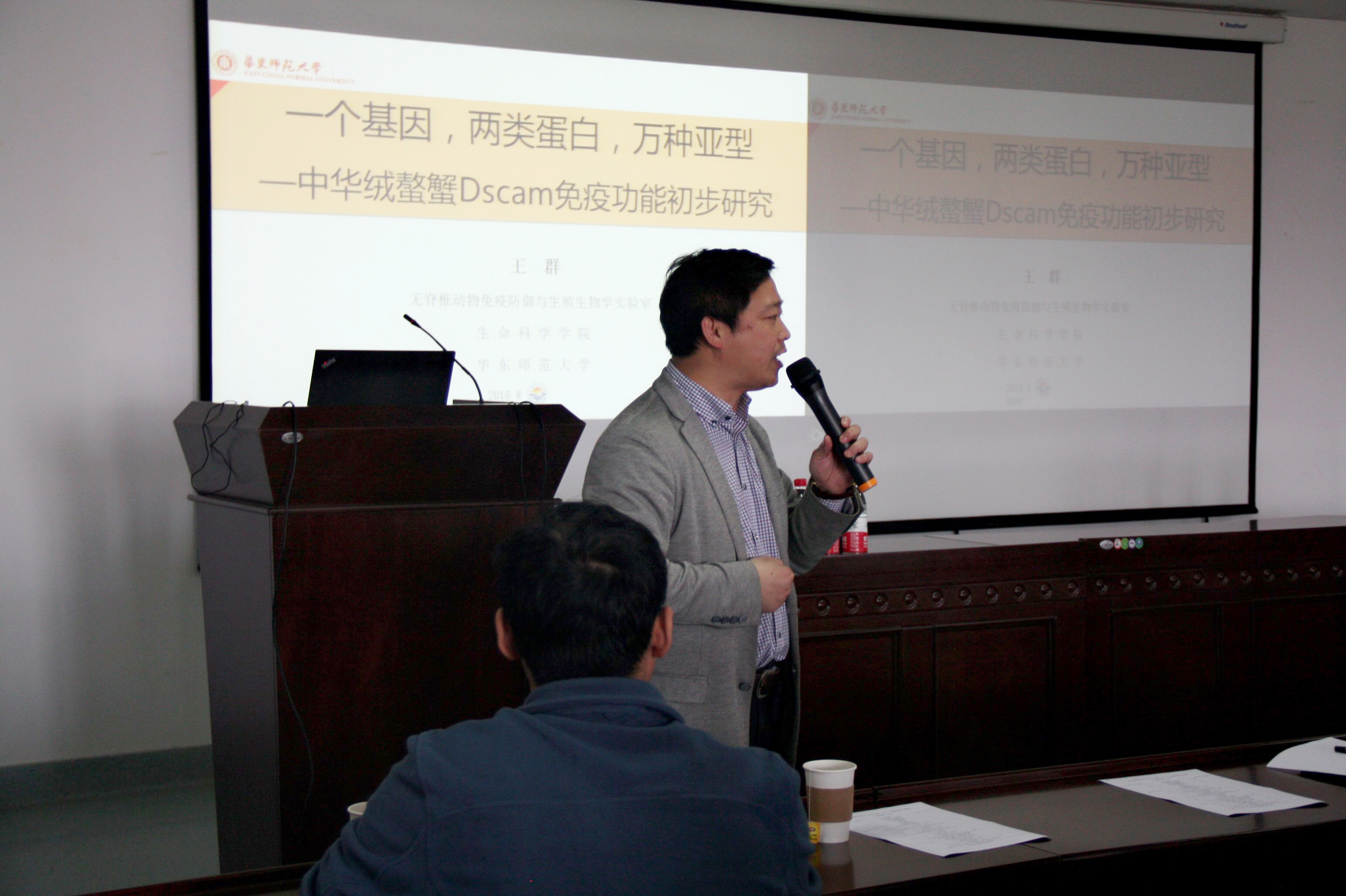 此次会议有幸邀请到了无脊椎动物免疫防御与生殖生物学实验室王群教授作专题讲座。王教授以“一个基因,两类蛋白,万种亚型”为主题,对中华绒螯蟹Dscam免疫功能的初步研究进行了介绍。王教授以节肢动物中华绒螯蟹为切入点,通过对其独特性以及相关研究难题的介绍,激发了同学们的兴趣,进而引出了此次报告的核心——EsDscam基因对中华绒螯蟹免疫功能的影响。报告过程中,王教授从基因的简介及独特性、研究过程大事记开始,讲到基因带来的“类抗体假说”,并详细地介绍了该基因对免疫功能调控相关机制的前沿进展。王教授从已有结论中提出新问题,用问题引导的方式,为同学们展示了科研的思路,启发了同学们的思考,使得同学们对“自上而下和自下而上”地研究问题有了相应的了解。所谓“学无止境”,正是孜孜不倦、精益求精的科研态度使得人们一步步揭开了生物世界的神秘面纱。在提问环节,同学们对于实验一些细节与思路提出了自己的疑问,而王教授以严谨的科研态度、独到的见解,一一进行了回答。江文正教授也就“类抗体假说”以及Dscam对于抗菌肽表达调控等与王教授进行了交流,会场上学术气氛十分浓厚。