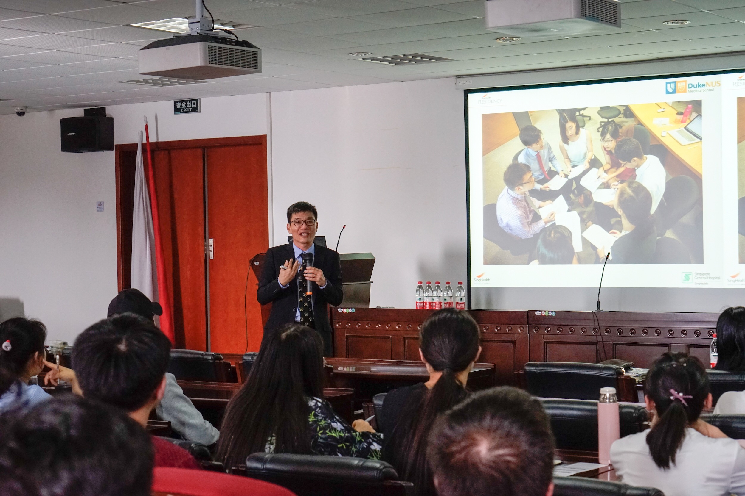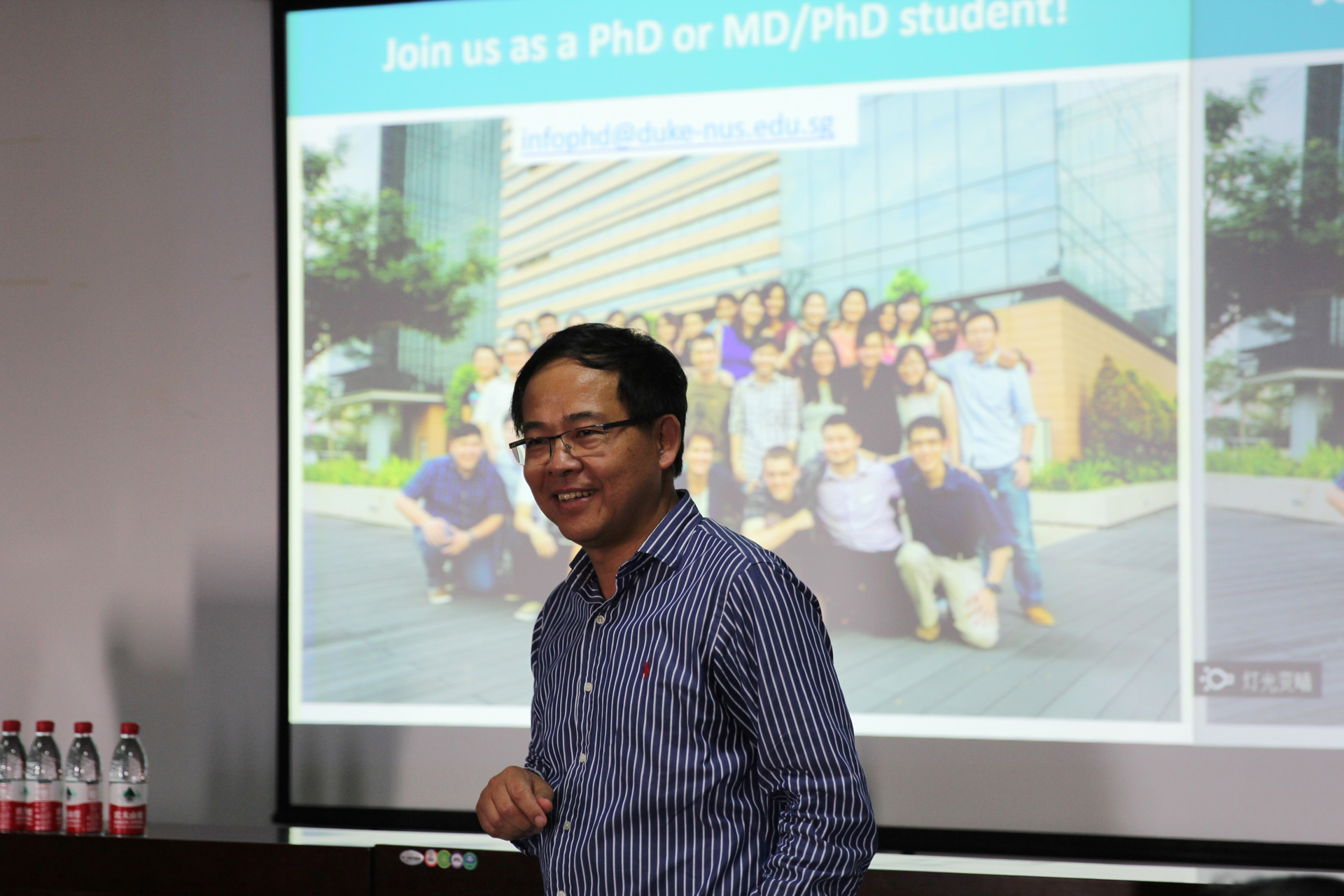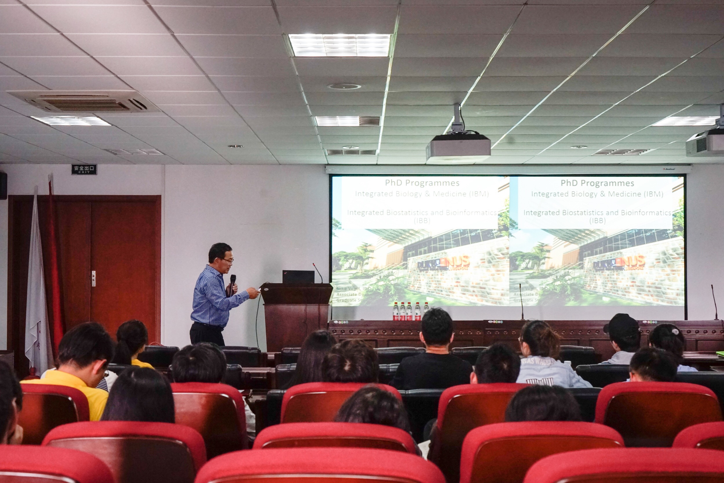 在听完对大学的介绍后,性吧82届的杰出毕业生,现任新加坡Duke-NUS医学院教授,新生感染性疾病研究所所长的王林发院士热情洋溢地和我们分享了他在国外多年来的留学以及研究经历,并以自己在Duke-NUS医学院中的实验室为例,介绍了这所学校的师资力量和办学条件。他着重介绍了现在杜克-新加坡国立大学医学院的两个MD和PhD项目——IBM(Integrated Biology and Medical)和IBB(Integrated Bio-statistics and Bio-informatics)前者的项目在攻读结束后即可获得生物和医学的双学位,而后者更是新加坡一个新兴的生命医学科学计划的产物。在当前生物统计及数据分析方面的人才供不应求的时代,这个专业的开设很有利于学生的后续发展。在演讲最后,王院士也向我们发出了邀请函,以自己优秀的学生——性吧的赖玉萍教授为例,希望有志于这所学校的学生也和赖老师一样勤学多思,用于发问。给自己发出挑战,让未来多一种可能性。