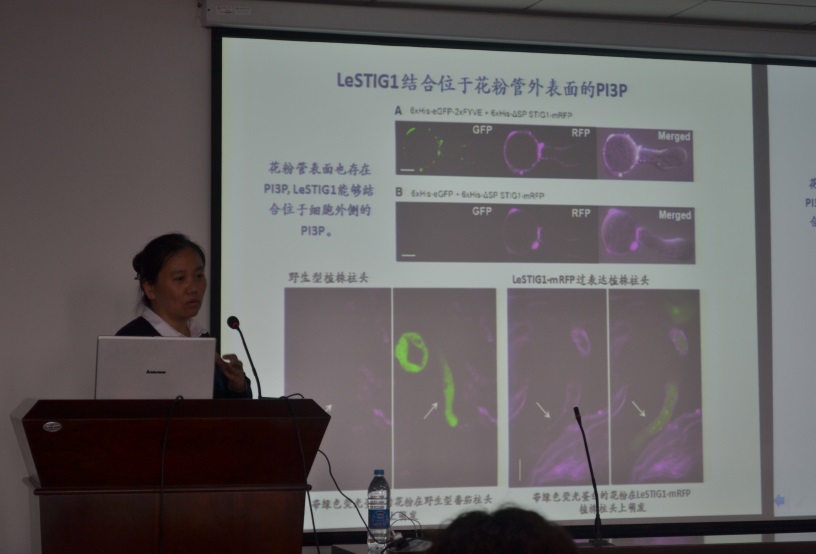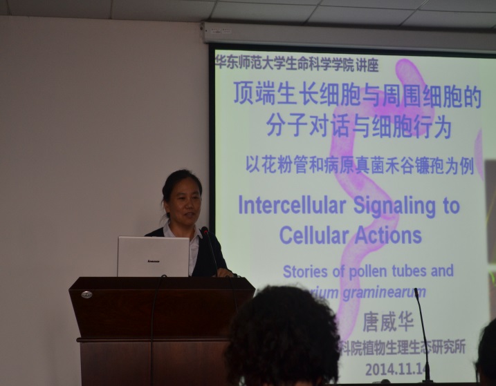 唐威华研究员此次学术报告的题目为"Intercellular Signaling to Cellular Actions (Stories of pollen tubes and Fusarium graminearum)"。报告主要阐述了近期她的研究团队围绕植物生殖发育和植物与病原真菌相互作用的研究。唐威华研究员集中研究了花粉受体激酶(LePRKs)信号复合体对花粉管生长的调控机制,过表达番茄花粉受体激酶LePRK1后,花粉管从管状生长模式转变为泡状生长模式,这一转变是通过LePRK1的下游激酶伴侣蛋白KPP及其互作因子PLIM2a调控花粉管肌动蛋白骨架来实现的,揭示了花粉管细胞的一种潜在的行为能力。研究组还发现STIG1作为雌蕊柱头分泌的信号小肽,能够结合位于花粉管表面的磷脂酰肌醇3-磷酸(PI3P),进而激活花粉特异受体激酶LePRK2所介导的信号转导,促进雌蕊中花粉管生长。在研究子囊真菌导致植物病害的分子机理方面,运用激光显微切割技术和芯片杂交,揭示了禾谷镰孢侵染植物的分子策略随侵染进程而改变。报告结束后,唐威华研究员还和同学们分享了正确的科研态度和科研方法,使同学们深受启发。