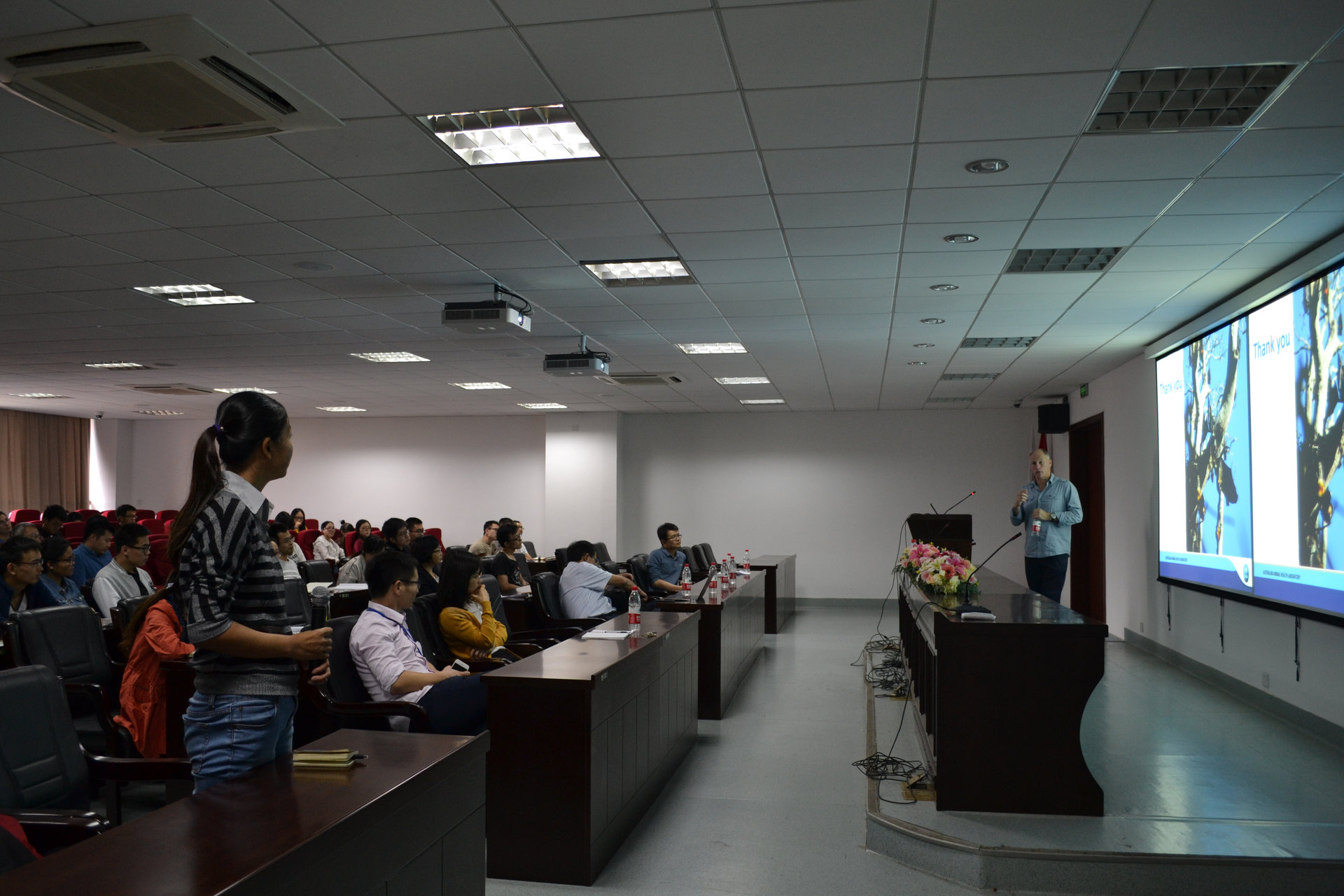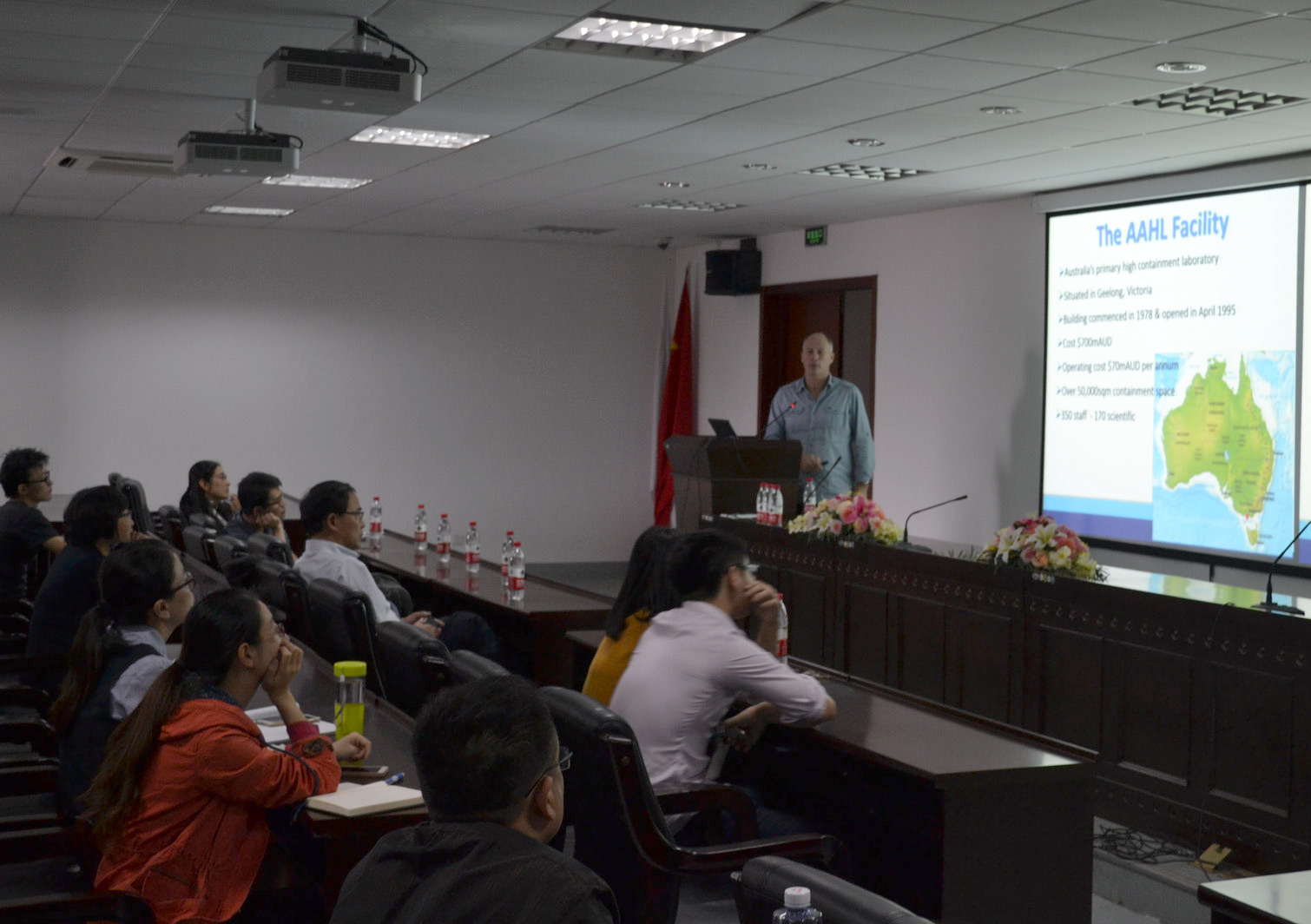 第一场学术报告由病毒学家Gary主讲,Gary长期在野外从事现场采样、调查工作,是病毒培养、鉴定专家,20年前即在P4实验室开展高危病毒分离、溯源工作,此次讲座用大量生动图片,深入浅出的讲述了fieldwork的病毒学家如何在野外进行高危样本采样、如何进行样本封存、以及分享在P4实验室工作的经验,为新病毒分离、鉴定、培养提供了大量珍贵经验。