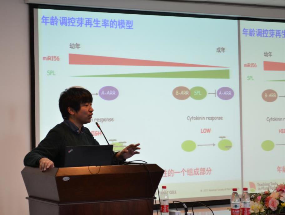 本次讲座是性吧为本科生和研究生开设的《植物生物学研究进展》课程的特邀专题讲座,王佳伟首先介绍了小RNA(miRNA)的定义和特点及功能,在大家更好地理解小分子RNA是如何调控生长发育的机理基础上,重点阐释了miR156与植物年龄信号之间的关系。在植物体内,miR156控制了幼年期到成年期的转化,miR156的表达量随着年龄的增长而逐渐减少,调控了植物生长发育和环境应答等多个过程。它是目前唯一已知的年龄分子标记,并提出了糖是一个保守的年龄信号,利用卡路里限制模型和人类的年龄途径相联系,引起了大家进一步的讨论和交流。