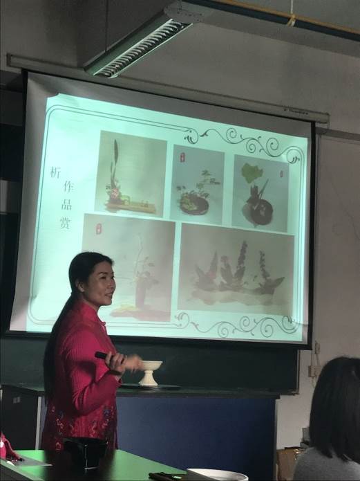 下午1点,活动正式开始。活动首先由小原流三级家元教授游巧芳老师为大家介绍插花流派、花色、花型等内容。在大家初步了解插花相关知识之后,各自领取花材,制作插花作品。