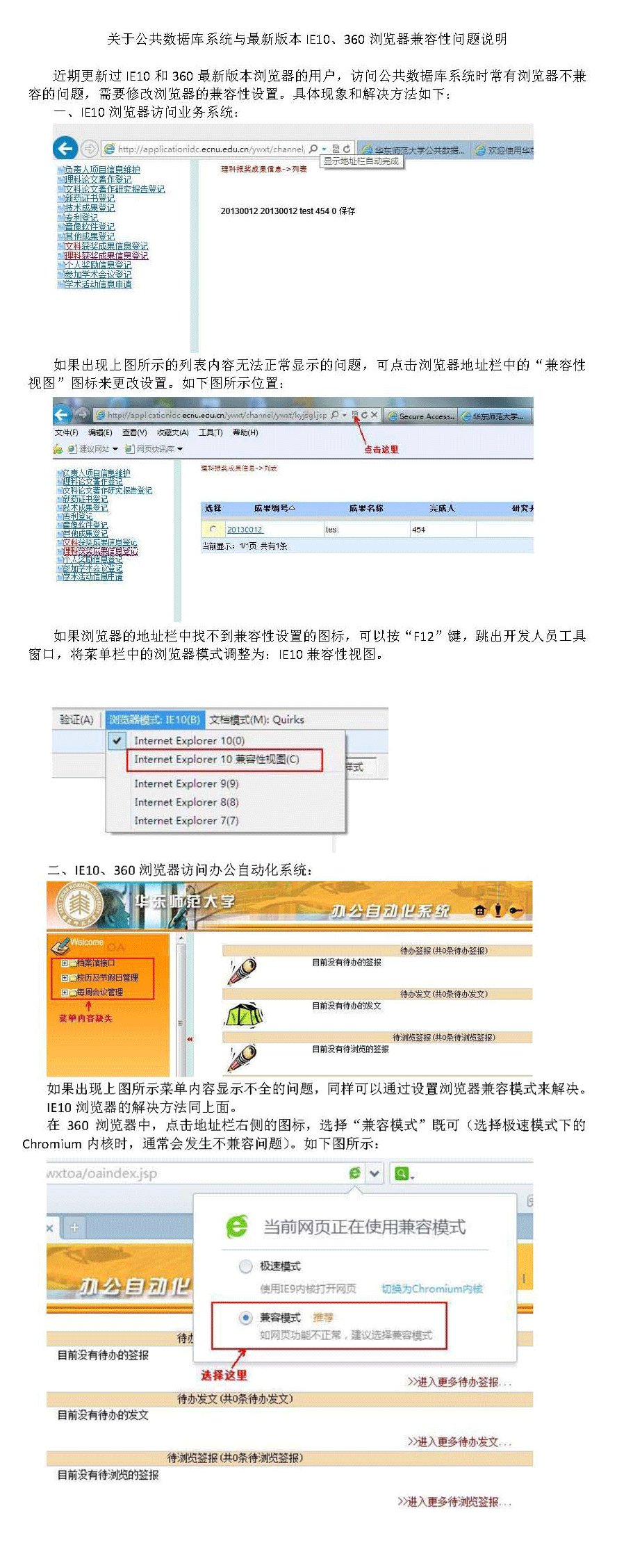 关于公共数据库与最新版本IE10、360浏览器等兼容性问题说明