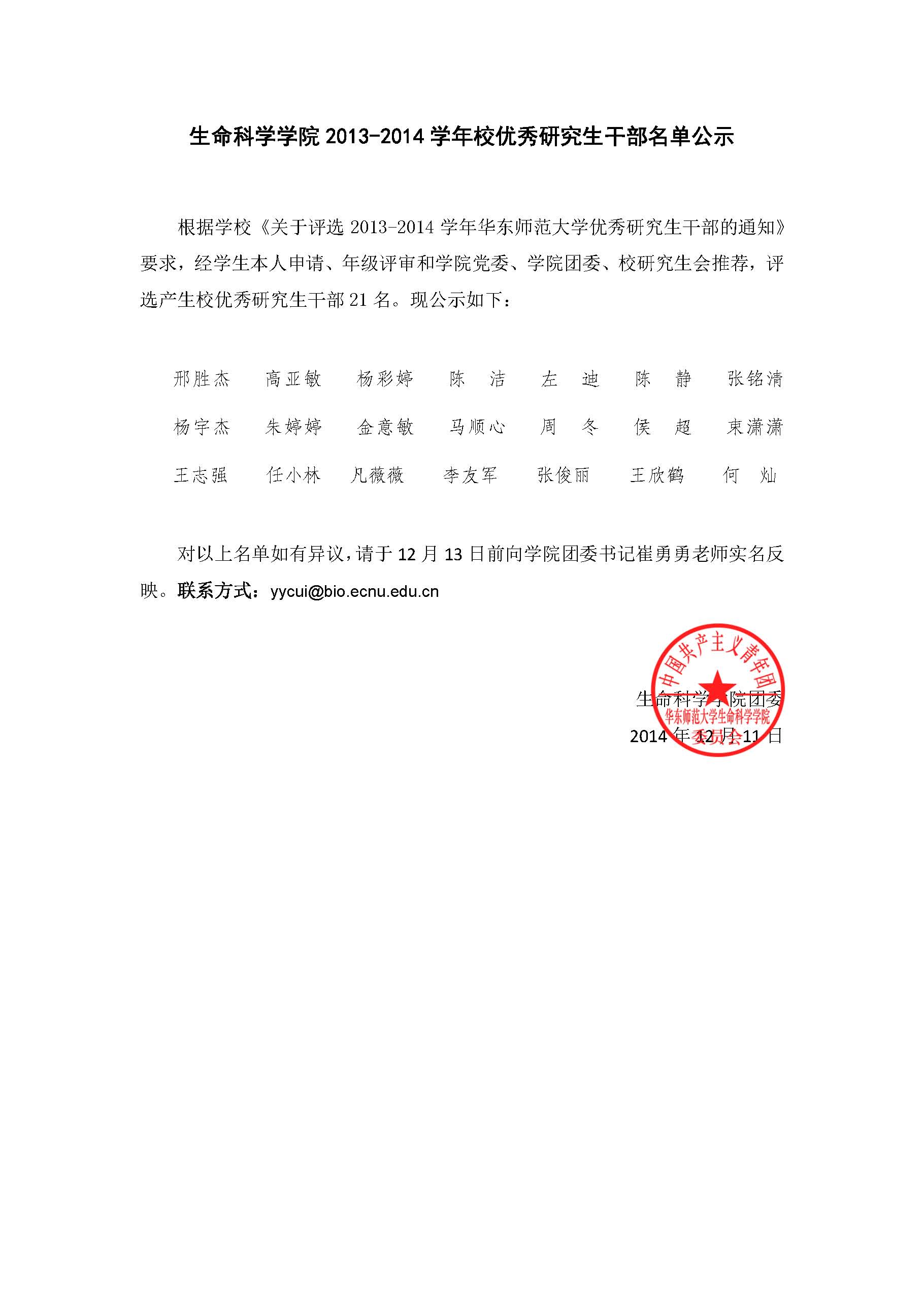 性吧 2013-2014学年校优秀研究生干部名单公示
