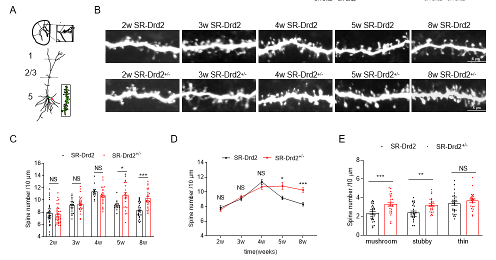 前扣带回皮层(ACC)是一个与情绪如焦虑和抑郁密切相关的脑区,研究者使用SR-Drd2+/-大鼠研究Drd2在ACC突触发育中的作用。研究者追踪了SR-Drd2大鼠和SR-Drd2+/-大鼠ACC第5层 Drd2阳性神经元上树突棘的发育时程,发现Drd2在调节突触修剪而非突触形成中起到重要作用(图2)。此外,青春期Drd2介导的突触修剪缺陷会导致成年期神经元兴奋性增加和焦虑样行为。