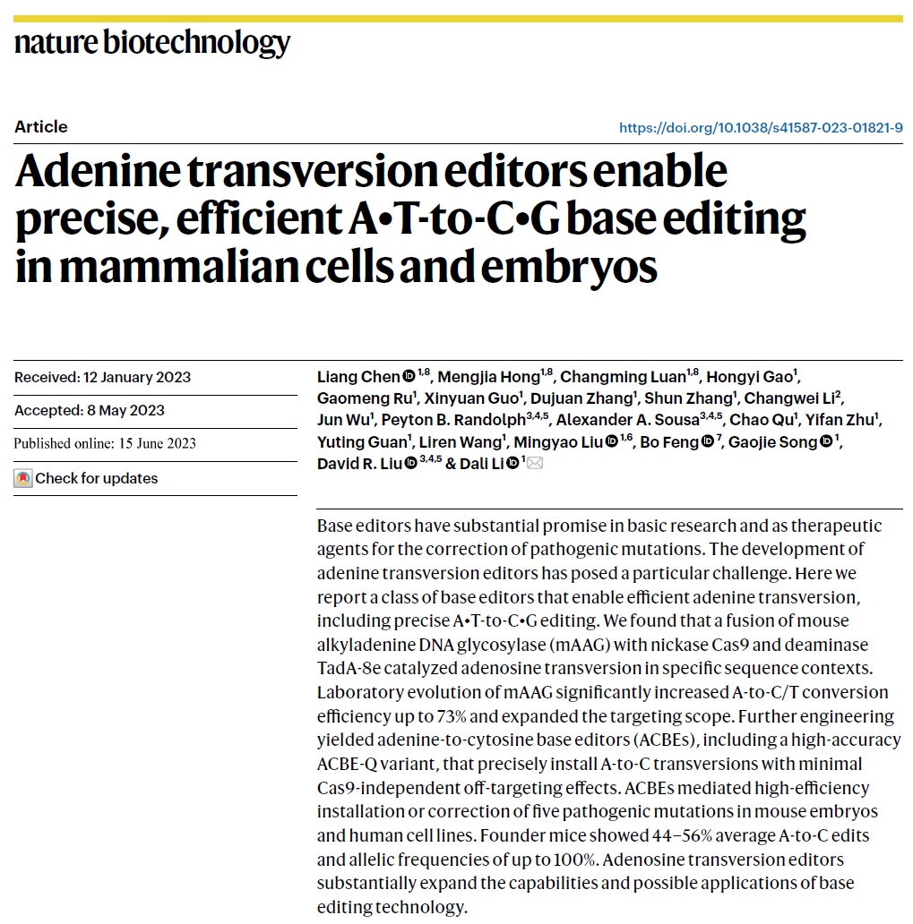 性吧 李大力教授团队继2022年10月在国际著名学术期刊 Nature Chemical Biology 报道新一代精准安全的腺嘌呤碱基编辑器ABE9以及11月在国际著名学术期刊 Nature Biotechnology 报道高精度新型胞嘧啶碱基编辑系统Td-BEs后,一年不到又迎来新的技术突破,2023年6月15日该团队再次在 Nature Biotechnology 上发表了题为“Adenine transversion editors enable precise, efficient A•T-to-C•G base editing in mammalian cells and embryos”的研究论文。