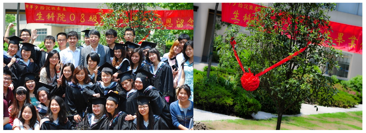 题记:闵行校区实验B楼前有一株月桂树,矮矮的个头,稀疏的枝叶,一块石头静静地依偎在它的脚边,两个略显青涩的搭档愣头青般地竖立在大楼中央的空地上。一年前的今天,生科院08级的毕业生,在这里,把承载了97人对生科院与母校衷心祝福的月桂树和无名石埋藏在师大闵行校区的泥土里,告别了本科四年的青葱岁月,背上行囊,走向祖国各地。
